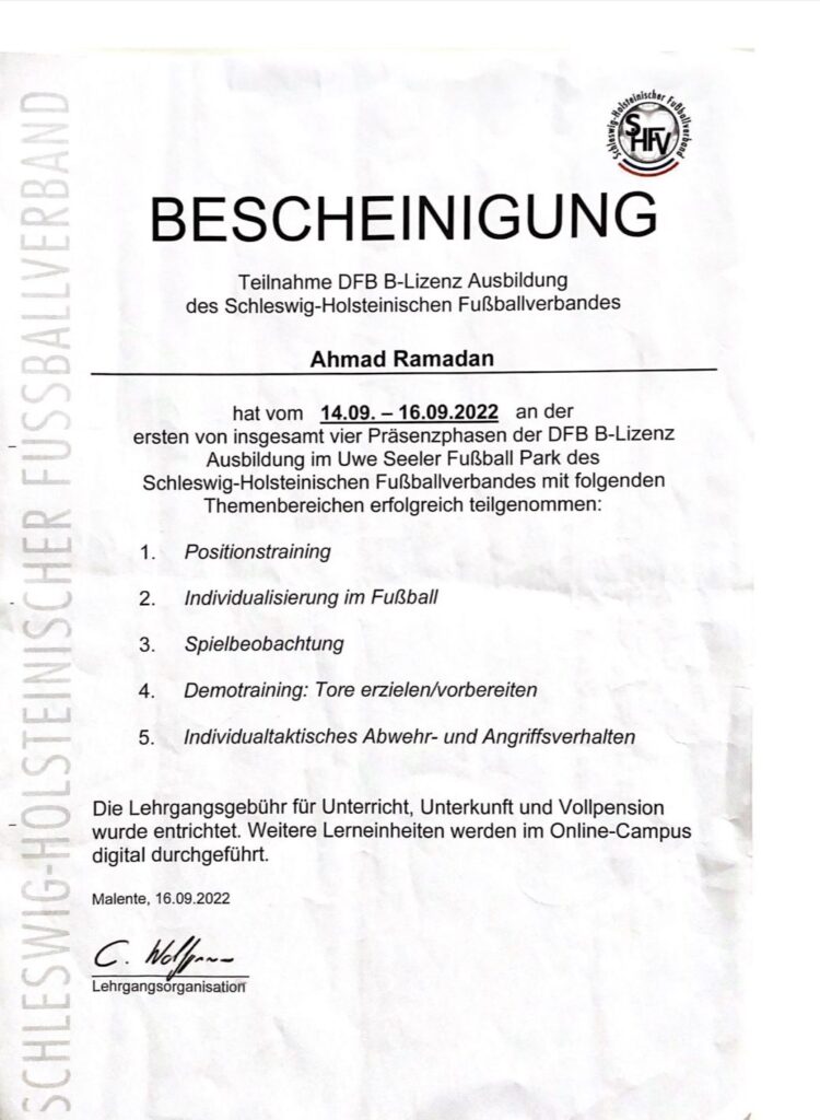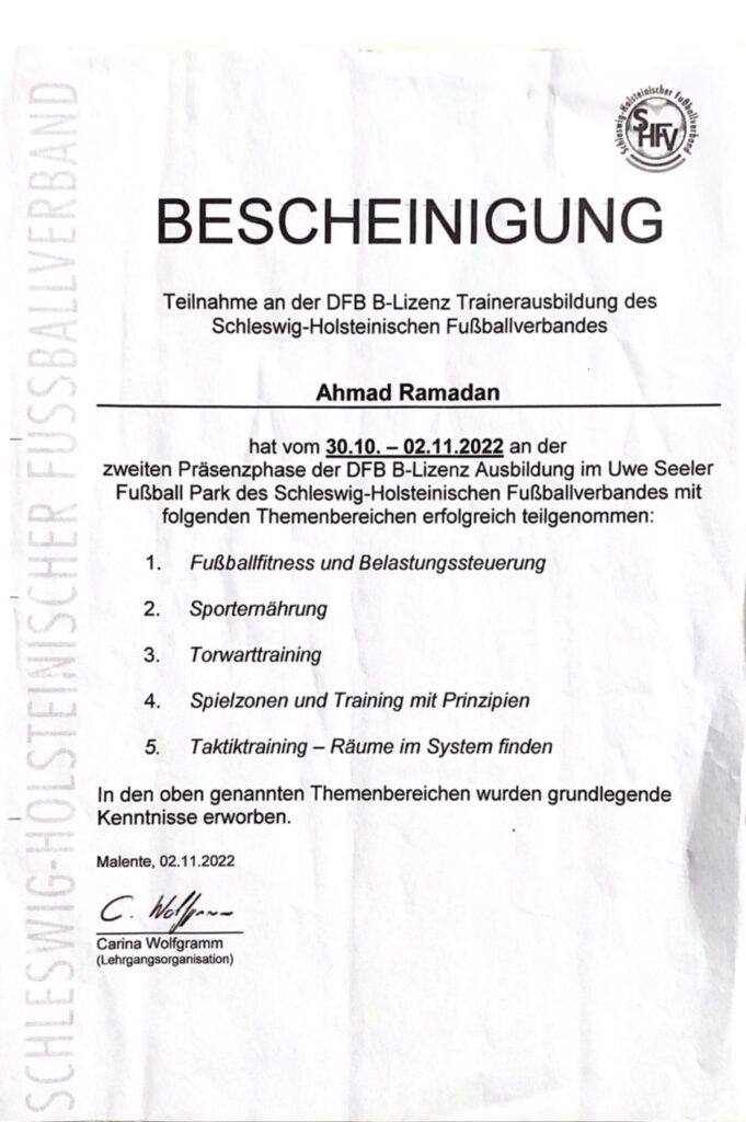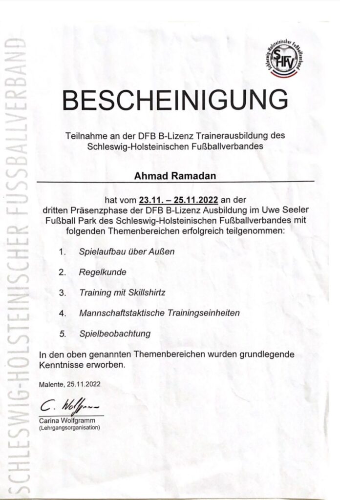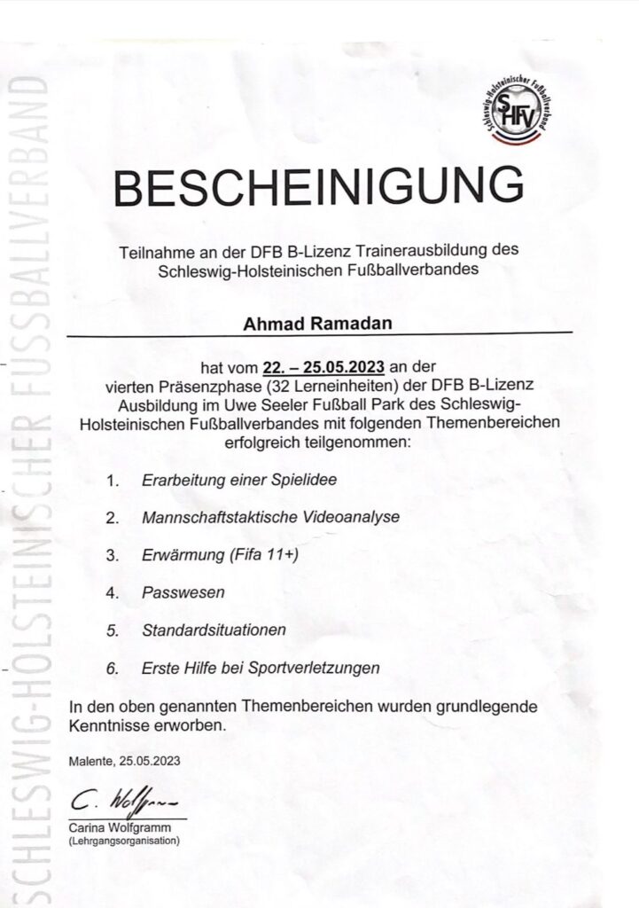 Die B-Lizenz des Fußballverbandes ist eine Qualifikation, die umfangreiches Fachwissen über die Trainingsmethodik, Taktik und Spielvorbereitung im Fußball vermittelt. Sie befähigt uns, Mannschaften professionell zu betreuen und Trainingskonzepte auf einem hohen Niveau anzubieten. Mit dieser Lizenz können wir sowohl Kinder als auch Erwachsene in ihren fußballerischen Fähigkeiten fördern und fordern.